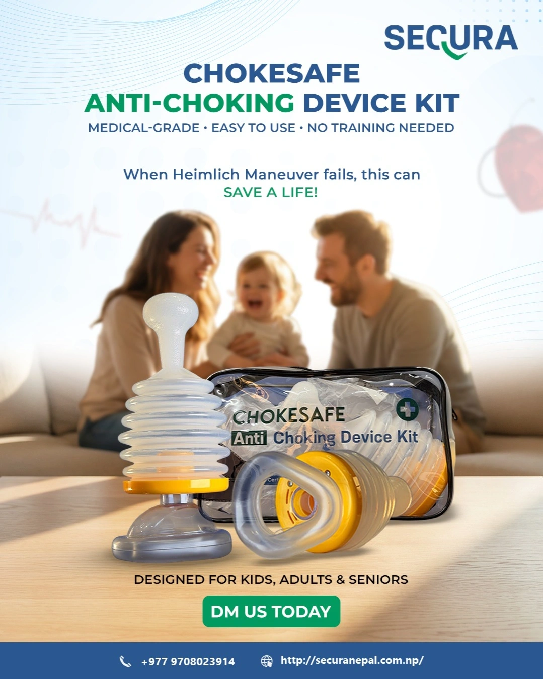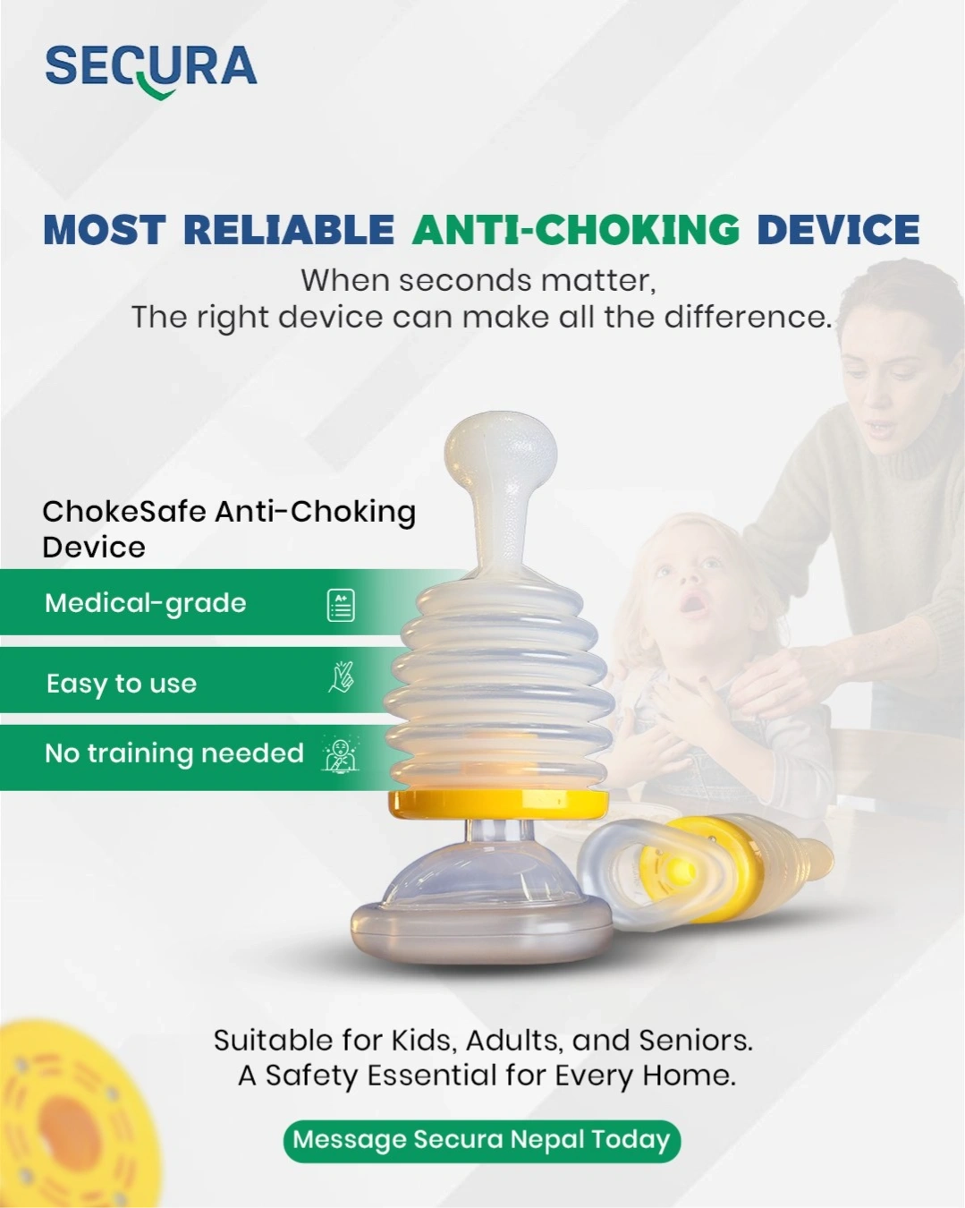 Be prepared for life‑threatening choking emergencies with ChokeSafe, Nepal’s trusted anti‑choking device. Whether at home, school, or while traveling, ChokeSafe helps you act fast when every second counts. Using strong, controlled suction, it removes airway obstructions when someone cannot breathe, cough, or speak — with no electricity or training required.